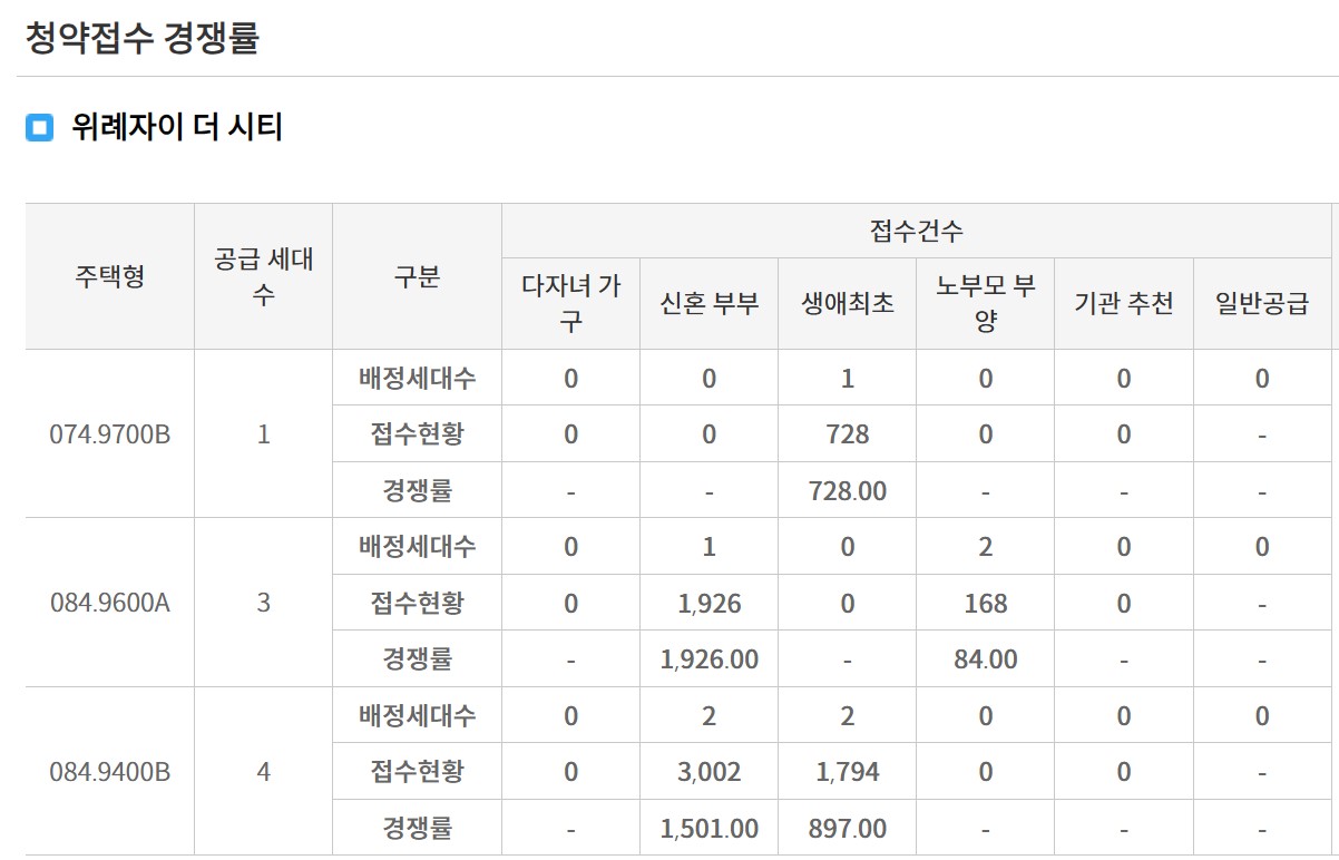 위례 자이 더 시티 청약이 7월 8일 접수 마감하였으며, 7월 11일 목요일 청약 당첨자 발표만 남았습니다. 신혼부부 특별공급 84A타입은 1,926대 1의 높은 경쟁률을 보였습니다.